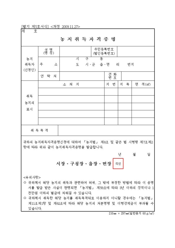 경매나 낙찰을 통해 농지를 취득한 경우에도 7일 이내에 관련 서류를 제출해야 합니다. 서류를 제출하지 않을 경우 토지는 물론 입찰보증금까지 상실할 수 있으므로 농지취득 적격성 입증조건을 숙지하는 것이 좋습니다. 또한, 토지를 취득한 후 이유 없이 농사를 짓지 않거나, 무단으로 관리를 타인에게 위탁한 경우에는 처벌 대상이 되므로, 농지 구입 시 반드시 잘 알아보고 결정하시기 바랍니다.