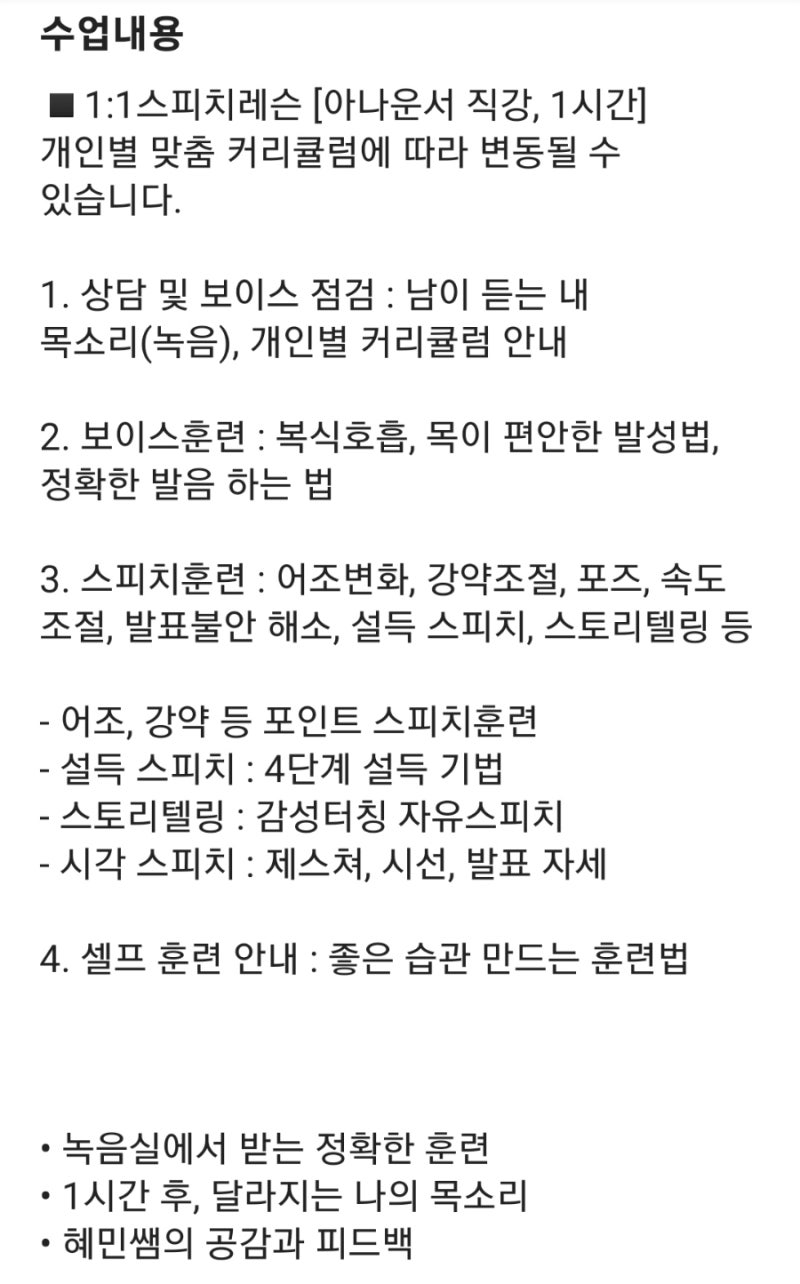 올해 상반기에는 #인사이트라는 직장인 커뮤니티를 통해 많은 사람들을 만나고 알게 되었습니다. 그 중 #스피치레슨 전부터 제대로 된 스피치 레슨을 받고 싶었는데, 마케팅 그룹의 리더였던 커스텀 의자 브랜드 사이즈 오브 체어의 CMO님 덕분에 알게 됐어요. . 왜? 회사에서는 제대로 설명하고, 제대로 제시하고, 제대로 소통하고 싶어요. CMO가 추천하는 OK!연기 스피치 레슨을 미리 신청했는데, 다행히 원하는 토요일 오후에 수업을 들을 수 있었습니다. 이번 달에는 총 3번의 1:1 수업에 대한 리뷰를 올려드립니다. 수업은 50분인데 왕복 2시간 정도 걸렸어요. 2023.08.05 드디어 수업 첫날 집에서 먼 길을 왔습니다. 수업 장소가 보라매역에서 도보로 5분거리에 있어서 처음 가봤습니다. 매우 어색했습니다. 그 곳~ 오늘 수업에서 새로운 내용을 많이 배웠기 때문에 기억하고 다른 분들께도 도움이 되었으면 하는 마음으로 간략하게 적어보겠습니다. > 오늘 수업에서 배운 내용입니다. 말을 할 때 가장 중요한 것은 호흡이다. 호흡은 습관이다. 말을 할 때는 항상 코로 숨을 들이쉬고 입으로 내쉬어야 내용이 명확하게 전달됩니다. . 의식적으로 코로 숨을 쉬고 말할 때 입으로 숨을 내쉬는 습관을 기르세요(이것이 #배호흡입니다). 호흡은 폐활량과 관계가 없다고 합니다. 사람들이 말을 할 때 ‘~스’ 같은 불필요한 말을 하는 걸 처음 봤거든요. 저는 말을 먹는 타입이라 정확한 발음이 필요해요. 프레젠테이션을 할 때 항상 숫자가 가장 중요하기 때문에 숫자에 힘을 실어야 합니다. . 단어의 초성을 강조하면 신뢰도를 높일 수 있습니다. 상대방이 들을 수 있을 정도로 조금 느린 속도로 말해야 합니다. 놀랍게도 ‘매우, 매우 어렵다’라는 단어에는 ‘안녕’을 발음하지 않습니다. , 정확하게 해야 합니다. ‘가’를 발음할 때는 아래턱을 더 내려야 합니다. ‘갑자기’ 등의 발음에서 긴장자음을 이해합니다. 손과 같은 제스처는 문장에서 단어의 의미를 찾는 데 도움이 될 수 있습니다. . 많은 사람 앞에서 발표할 때에는 용이 불을 뿜는 것처럼 코로 숨을 들이쉬었다가 내쉬면서 고르게 말해야 합니다. 자신이 하고 싶은 말의 목적을 의식하고 상대방에게 말을 전하는 것과 단순히 말을 전하는 것에는 아주 큰 차이가 있습니다. 큰 차이가 있습니다. . 입을 너무 꽉 다물고 있으면 상대방이 자신을 무시하고 있다는 느낌을 받을 수 있으므로 앞니가 보이도록 입을 살짝 벌리는 것이 좋습니다. 2023.08.192학년 워킹맘으로서 토요일 아침은 항상 집을 청소하는 날입니다. 화분에 물주기, 밥 짓기, 청소기 돌리기, 바닥 청소하기, 쓰레기통 비우기, 빨래하기, 설거지하기 등등. 아니, 확실히 깨끗하게 걸레질을 했는데 거실 바닥에 기름이 묻어나네요. 이게 뭔가요?? 원인을 찾아보았더니, 범인은 방이나 쓰레기 처리장이었습니다. 이번 주는 더욱 심각하네요.. 이 엄마는 중학교가 빨리 지나갔으면 좋겠습니다. 오늘도 그녀의 인내심이 올라갑니다. 오늘 날씨가 너무 더웠는데 문제는 지하철인지 지하철인지 입니다. 식당 안은 너무 추워서 땀이 빨리 마르고 집에 오면 속이 쓰렸다. 오늘 새로운 정보를 알게 되어서 기억해두려고 여기에 남깁니다. 신문 뒤에 있는 저 사람, 네, 맞아요, 제 남편이에요. 직장에서는 부유한 매니저지만, 집에서는 거의 거지 같은 존재다. 남편의 이미지를 보호하기 위해 얼굴을 가렸습니다. 제가 오늘 새롭게 배운 것은 그동안 많은 강연과 발표를 하면서 한번도 생각하지 못했던 것이었습니다. 알고 있었기 때문에 신선했습니다. 예를 들어 프레젠테이션을 할 때 급하게 대본을 쓰고 읽어야 했고, 문장 하나하나에 대한 의식이나 자각을 갖고 발표한 적이 없었다. 그런데 아마도 그 코치가 연기 레슨을 전문으로 하는 코치였기 때문이었을 것이다. 사람의 마음을 움직이고 설득하는 공감의 방법인 목소리에 대해 가르쳐주셨어요. > 오늘 수업에서 배운 내용입니다. 각 문장에 담긴 단어를 의식하고, 그 문장이 상대방에게 의미와 메시지를 전달한다는 생각을 가지고 말하세요. -로 읽어야 합니다. : 쓰고 있는데 계속 틀리네요. 자주 잘못 발음되는 자음: ㅈ(ji-tseung). 참여해 주셔서 감사합니다. 글자를 하나씩 정확하게 발음해 보세요. ~ : 강하게 말하지 말고 첫 단어를 강조하세요 (나의 나쁜 버릇을 발견했습니다). 서브텍스트의 중요성: 결국, 말할 때 미리 말하는 문장이 중요합니다. 출석 : 참세카게 선생님께서 먼저 시연을 하신 뒤, 문장을 따라하며 연습했습니다. 같은 문장이라도 왜 이렇게 다르게 들리는지 궁금합니다. 다음 수업을 위해 녹음을 해야 해요. 코치님 말씀 들으니까 너무 좋아요~~ 2023.08.26 2교시 3교시 발음이 불명확한 ‘jijjt’에 맞춰 모음 발음 연습을 하라고 해서 찾아보다가 이 영상을 발견했습니다 . 한국어 동아리의 뜻은 이것이다. 나는 왜 몰랐을까? 몰랐을 수도 있고, 잊어버렸을 수도 있고, 배우지 않았을 수도 있습니다. 세 번째 왔을 땐 좀 친근한 것 같았어요. 궁금해서 ClassU 사이트에서 #adultspeech를 검색해 봤습니다. 제가 지원한 한석준 아나운서도 있다?! 나에게는 이 세 가지 수업이 