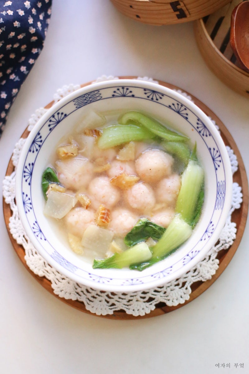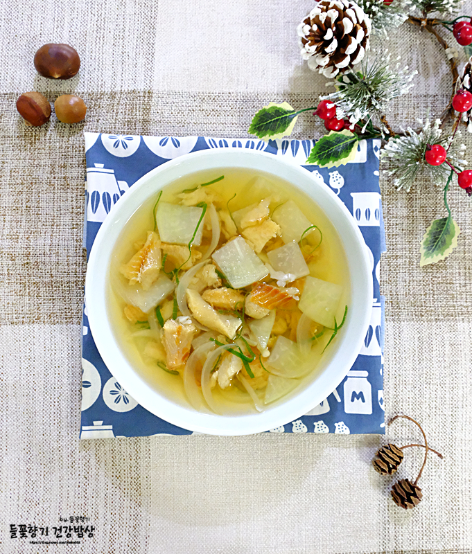 재료 : 명태 또는 황태 40g, 무 230g, 두부 150g, 대파 1대, 다진마늘 1큰술, 조선간장 2큰술, 멸치육수 1.3리터, 참기름 1큰술, 소금 한 꼬집, 후춧가루(큰스푼 =) 계량스푼)