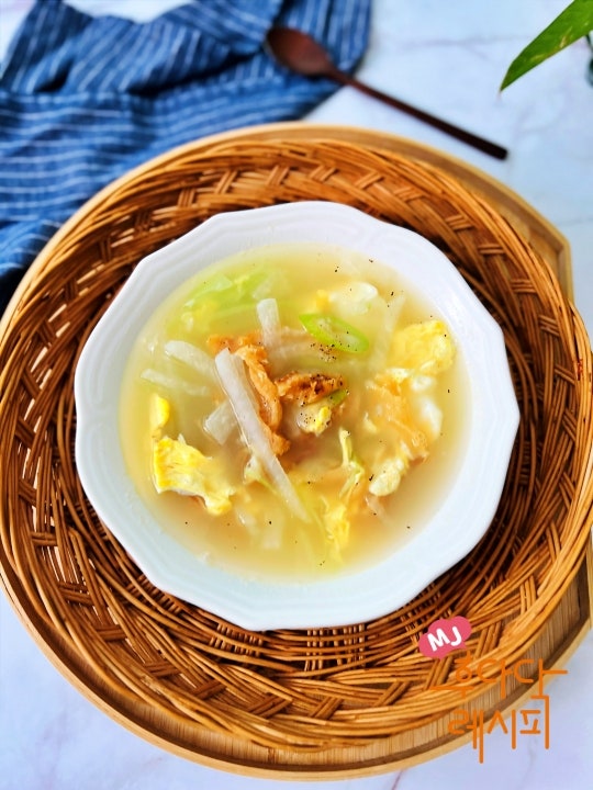 1. 황태나 명태를 40g 정도 준비합니다. 오랫동안 담가둘 필요는 없습니다. 찬물을 부어 살짝 담궈서 촉촉하게 만들어주세요. 그런 다음 짜내십시오. 손으로 만져보세요. 가시가 심한 느낌이 들면 손으로 떼어내서 준비해주세요. 물에 담그십시오. 불린 후 가위로 잘라서 떼어내시면 됩니다. 가시가 있으면 이물감을 느낄 수 있으므로 깨끗이 치워주세요. 먹기 좋은 길이로 잘라주세요. 2. 부재료를 준비하고 준비합니다. 무 230g 정도 입니다. 무는 작게 썰고, 두부는 먹기 좋게 썰어주세요. 대파는 어슷썰기해서 준비해주세요. 3. 프라이팬에 모두 넣어주세요. 참기름을 추가합니다. 참기름은 식용유에 비해 발연점이 낮아 불을 중약불로 조절하고 가열하시면 더욱 건강하게 드실 수 있습니다. 참기름이 많을수록 맛이 시원해집니다. 줄어들 수 있으니 적당히 넣어주세요. 약한 불로 볶습니다. 견과류 향이 날 때까지 볶습니다. 썰어놓은 무를 넣고 가볍게 섞어 볶아주세요. 4. 무에 수분이 생기면 육수를 붓고 끓여줍니다. 멸치육수 1.3리터를 붓고 끓입니다. 센 불로 끓입니다. 간장을 추가합니다. 간을 스며들게 하면 더 맛있습니다. 집에서 만든 간장 2큰술을 넣어주세요. 뚜껑을 덮고 불을 ​​중간으로 줄이고 국물을 끓입니다. 10~15분 정도 끓여주면 투명하고 부드러워지며 향이 잘 우러납니다. 육수를 넣고 푹 끓여주세요. 맛있는 곳이에요. 끓으면 국물이 하얗게 될 때까지 끓인다. 두부를 넣고 다시 끓으면 다진 파와 다진 마늘을 넣어주세요. 다진마늘 향이 올라오면 불을 중불로 줄여 조금 더 끓여 완성합니다. 불을 끄고 후추를 뿌려주세요. 맛을 보고 필요한 경우 소금을 첨가하세요. 그릇에 따뜻하게 담아주세요. 속을 달래줄 해장국 한 그릇입니다. 밥과 함께 먹을 수 있는 편안하고 부드러운 맛! 쌀쌀한 날씨에 더욱 딱이네요. 고소하고 상큼한 맛으로 만들어 보세요.