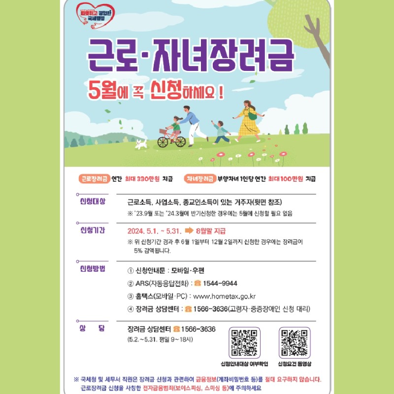 현재 종합소득세 및 근로자 인센티브 신청기간입니다. 이번달에는 종합소득세와 근로장려금에 대해 설명드렸으나 아직 자녀장려금은 도입하지 않았습니다! 확인해보고 소개해드리겠습니다. 1. 아동 인센티브란 무엇인가요? 2. 신청기간 및 납부일3. 아동 인센티브 신청 방법 목차