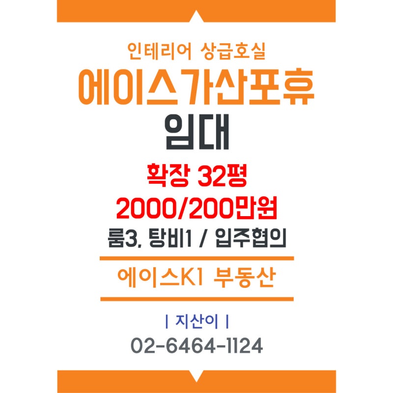 오늘도 만나서 반가워요. 귀하의 방문을 진심으로 환영합니다. 너무 어렵게 찾지 마시고 (골든찬부동산)에 연락하시면 조건에 맞는 부동산을 바로 보내드립니다. 전화: 0.2. 6.2.9.5. 2.2.0.0. 셀: 0.1.0. 3.3.2.3. 2.1.2.8. (편하게 문의주세요) 오늘은 아세가산포후 30평형 사무실 임대 공간을 소개해드리겠습니다. 에이스 가산포후 30평 사무실 임대 ① 가산디지털단지, 지하철역 7분 거리 ② 깨끗하고 관리가 잘된 신축건물 ③ 31평 규모로 증축 사용 ④ 사무공간 + 방3개 + 욕실 구조 ⑤ 180만원 월별 (황금찬부동산에 문의)주세요!