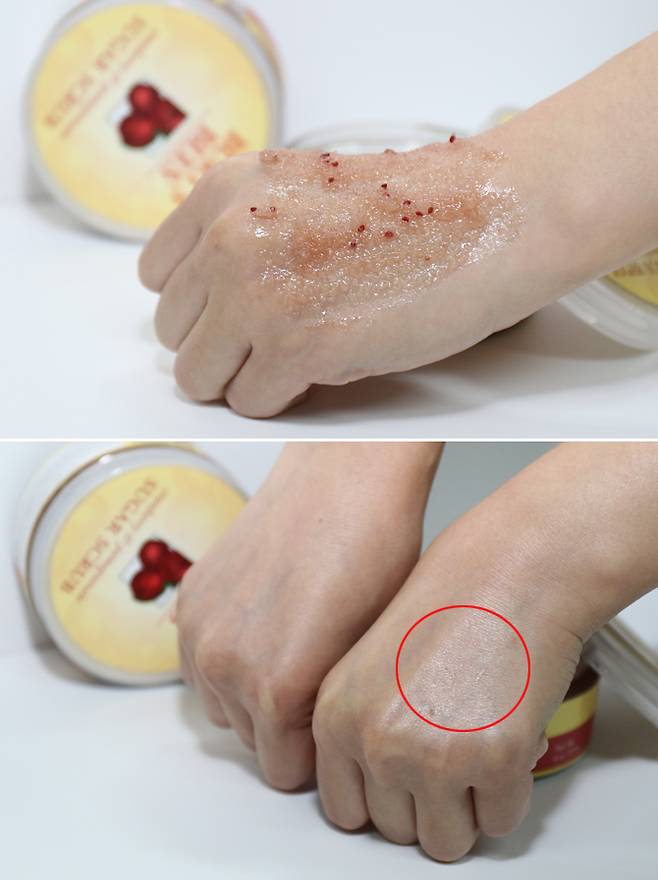 설탕 입자 크기가 각질 관리에 좋기 때문에 가벼운 자극으로 관리할 수 있어요. 입자가 너무 두꺼우면 긁는 듯한 느낌이 들고 아플 수도 있습니다.