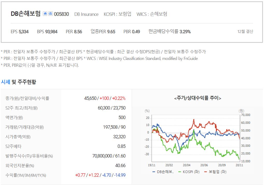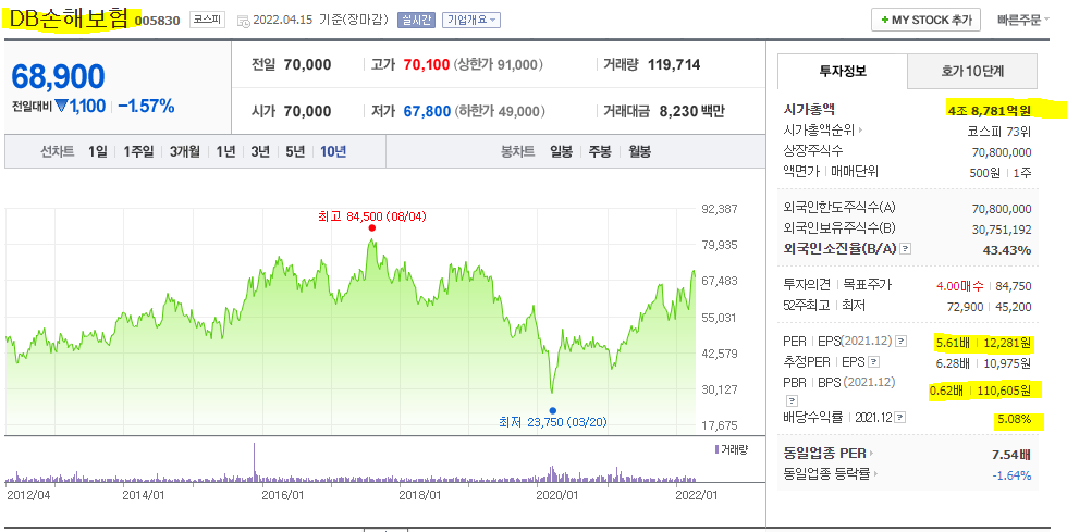 DB손해보험은 보험회사라는 이름에서 알 수 있습니다. 시가총액은 4조원에 달하고 외국인 비중은 43%에 이른다. 높은 비율의 외국인은 사람마다 의미가 다를 수도 있고 특별한 생각이 없을 수도 있습니다. 나는 기본적으로 그렇게 생각합니다. 한국뿐만 아니라 다른 나라의 주식은 언어가 다르고 문화가 다르기 때문에 더 신중하게 생각하고 선택합니다. 그리고 나는 상대적으로 안정적인 것을 선택할 것입니다. 제가 해외주식을 고를때 그렇게 해서 그런건지 모르지만 그렇게 잘못된 생각은 아닐겁니다. 따라서 외국인 비율이 높다는 것은 어느 정도 안정을 의미한다고 볼 수 있다.