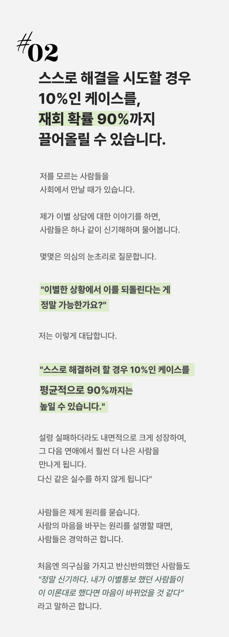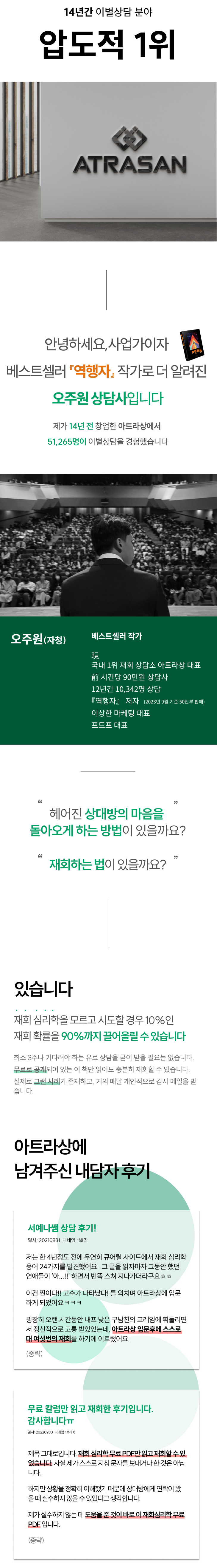 아트라상은 재회상담, 이별상담 전문업체입니다. 사람들이 아트라산을 방문할 때 어떤 느낌을 받나요? 미션5까지 강의를 들으면서 배운 것은 ‘나의 세계=타인의 세계=동기부여’였습니다. 즉, 이별 후 몹시 괴롭고 힘든 시간을 보내고 있는 사람이 옛 애인을 다시 만날 방법을 궁리하기 위해 지푸라기라도 잡는 심정으로 아트라산을 찾아왔음에 틀림없다. 그렇다면 이들의 심리를 바탕으로 아트라상을 본능적으로 분석해 보면 다음과 같다. 당신은 전문가입니까? 사기 아닌가요? 리뷰가 있나요? 전문적인 글쓰기로 당신의 능력을 보여주세요. 결국 ‘이별 후 절대 하지 말아야 할 6가지’라는 칼럼에서 반박한 부분은 제거가 완벽하게 이루어졌기 때문에 사람들이 아트라 조각상의 가치를 느끼는 것 같아요. 이번 칼럼에서는 본론에 앞서 자청이 자신의 경력에 ​​대해 먼저 이야기한다. 우연인지, 이별 후 절대 하지 말아야 할 6가지가 있기 때문인지는 모르겠지만 그는 직업 소개 6가지도 나열했다. 앞으로는 글을 쓸 때 운율 같은 작은 것에도 주의를 기울여야 할 것 같아요. 이별 후 절대 하지 말아야 할 6가지 행동과 그 이유
