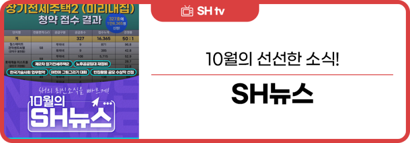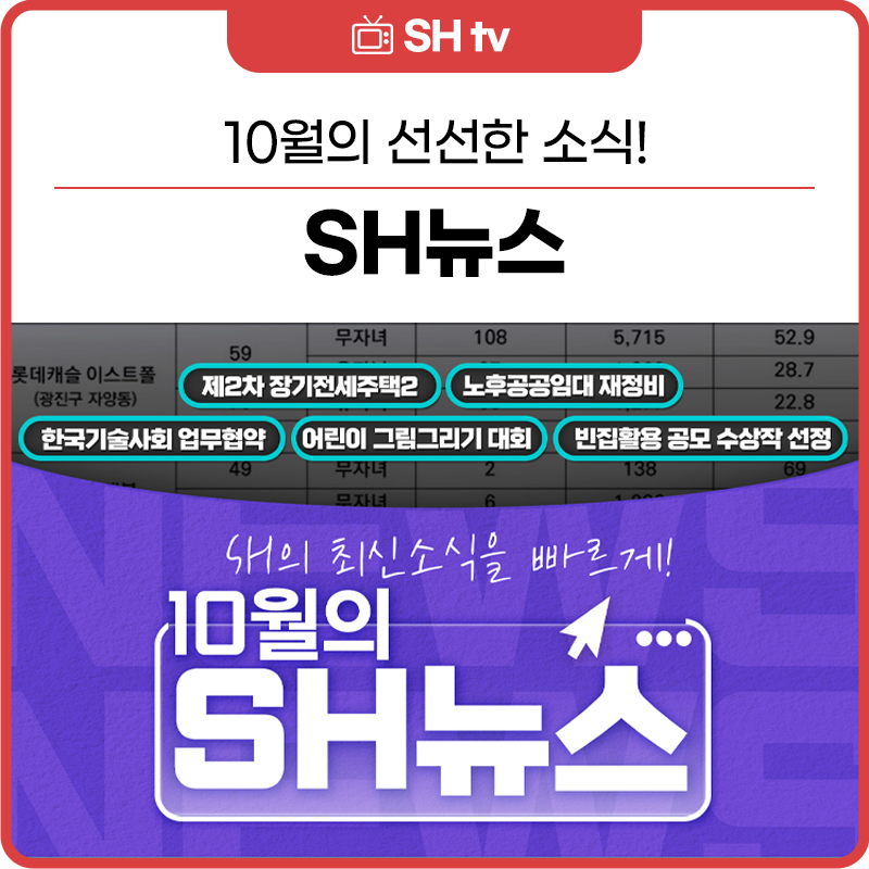 가을이 성큼 다가오는 10월, 우리집(신혼20년자주거주택, 장기임대주택 2가구) 임차인 모집 결과부터, 노후임대 재건축 선도사업까지 하계5단지, 상계마을단지, 서울시 빈집 활용 아이디어 공모전 당선자 선정 소식을 전해 드립니다. !서울주택도시공사의 다양한 소식을 지금 바로 확인해보세요!